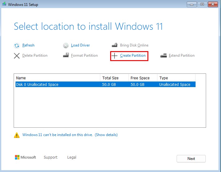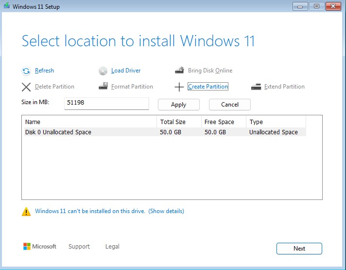 Select “Disk 0 Unallocated Space” ➔ “Create Partition”. Use the default “Size in MB” setting ➔ “Apply".