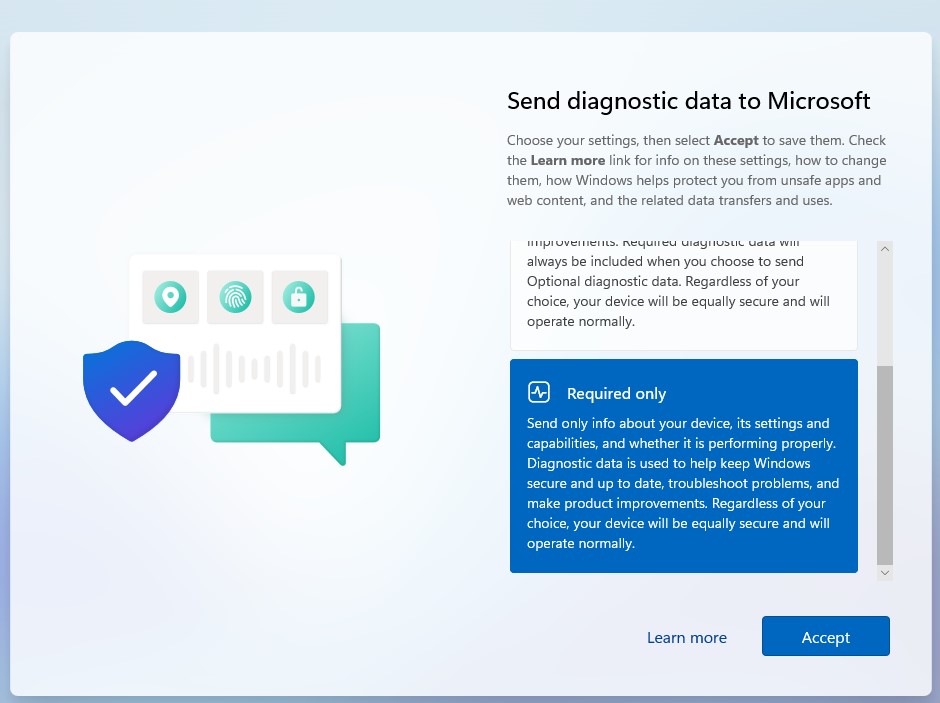 Choose “Required only” for sending diagnostic data to Microsoft.