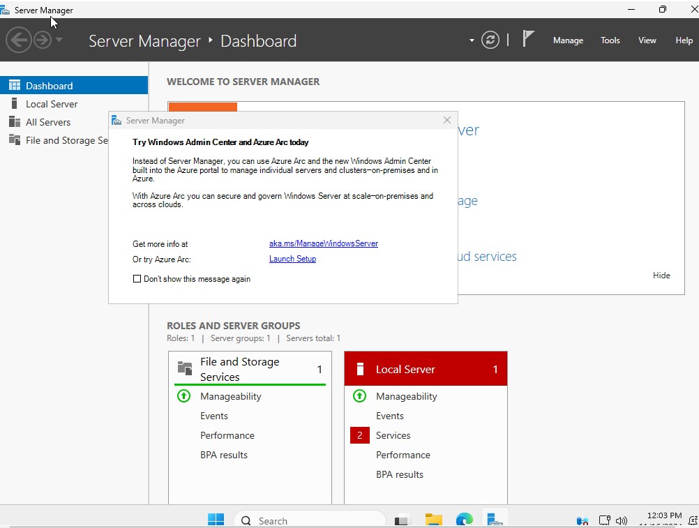 After signing in, you should see “Server Manager” Window. You can exit out of the dialog box to try Azure Arc.