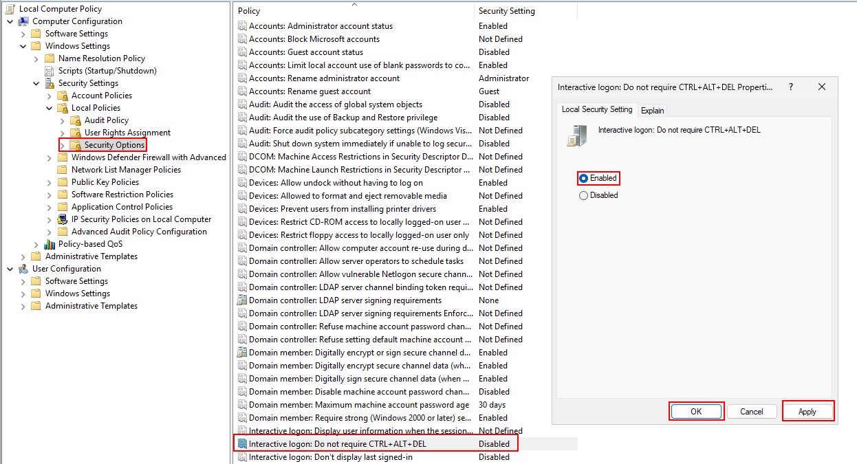 - Look for “Interactive logon…” ➔ Toggle from Disabled to Enabled ➔ “Apply” ➔ “OK”.