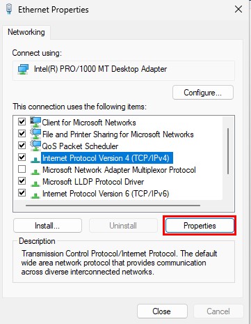 Select “Internet Protocol Version 4 (TCP/IPv4) ➔ “Properties”.