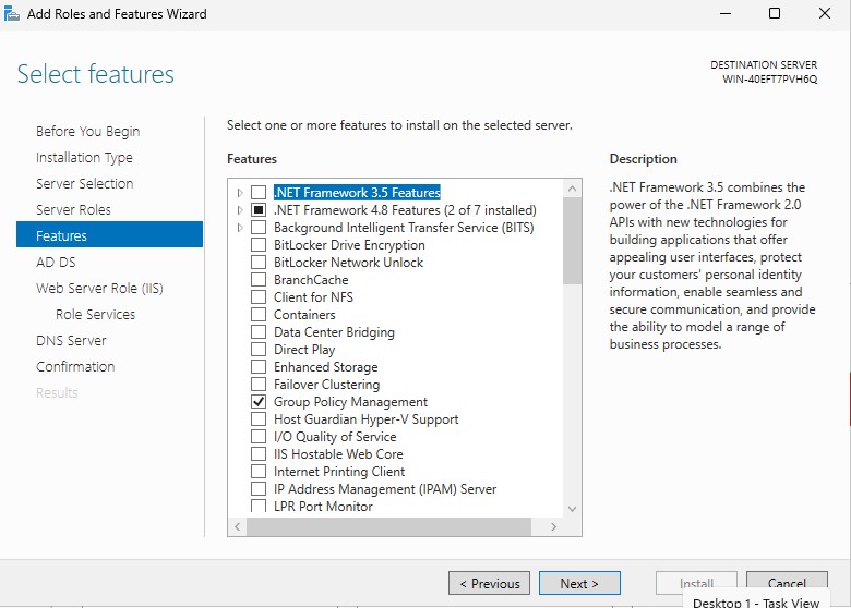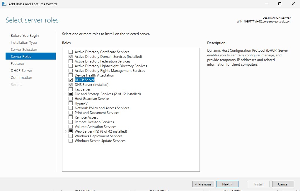 Another feature installation we selected was DHCP. This component allows the Domain Controller to assign IP addresses to its connected workstations, servers, and devices. We do this to assign additional control and centralized management to the Domain Controller.