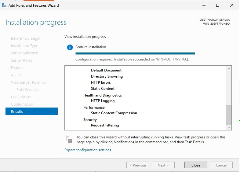 You will see a message in the notifications section of “Server Manager” when all of the features have been installed.