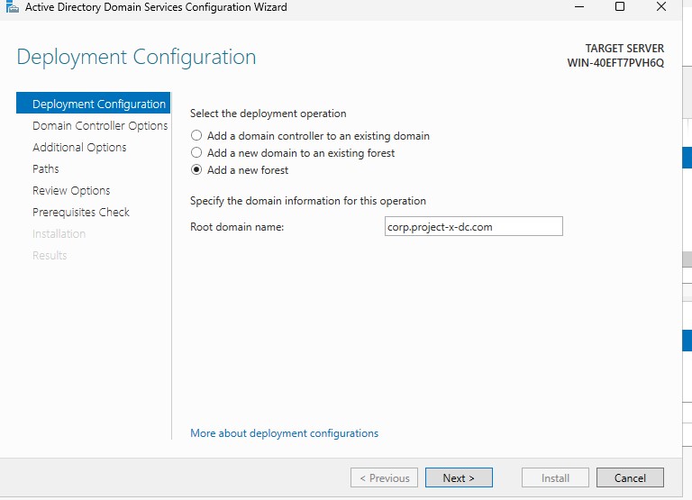Select “Add a new forest”. Then enter a root domain name, corp.project-x-dc.com.