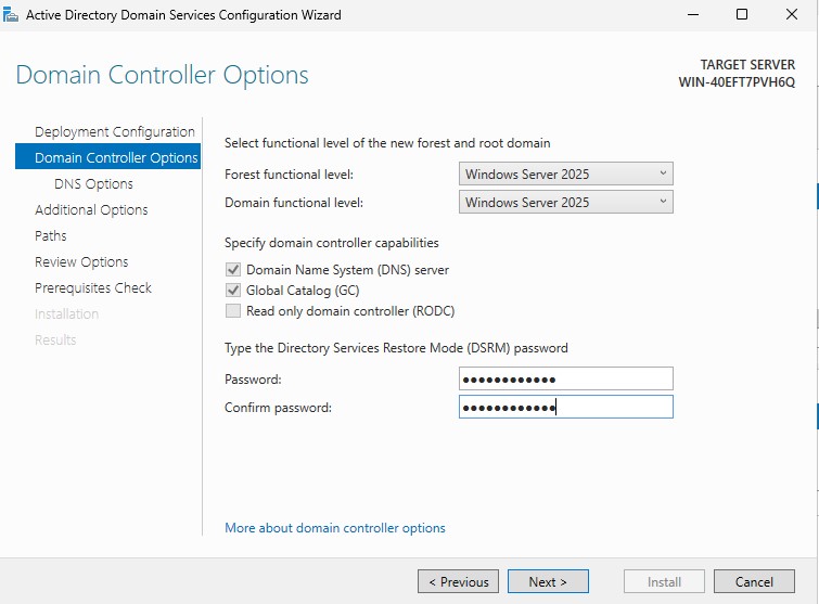 Leave the default options, for the Directory Services Restore Mode (DSRM) password, use the Administrator password (@Deeboodah1!). Select Next.