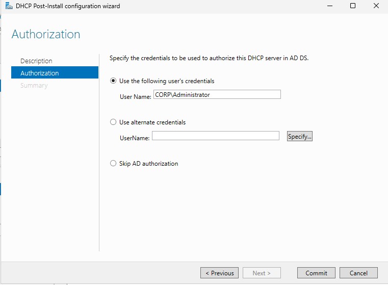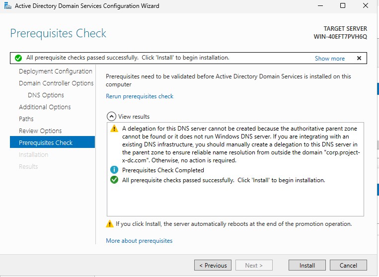 Leave the "NetBIOS domain name" to CORP, proceed with all other defaults until getting to the check screen.