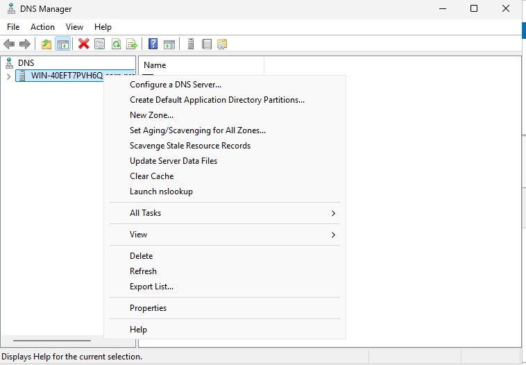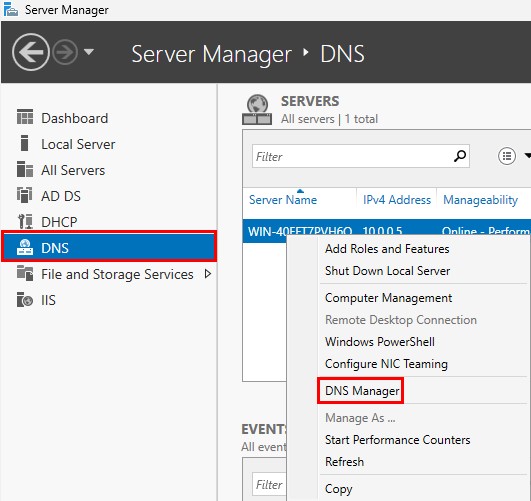 Go to “Server Manager” ➔ DNS ➔ Select the Server ➔ Right-click ➔ “DNS Manager”.