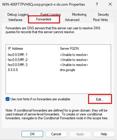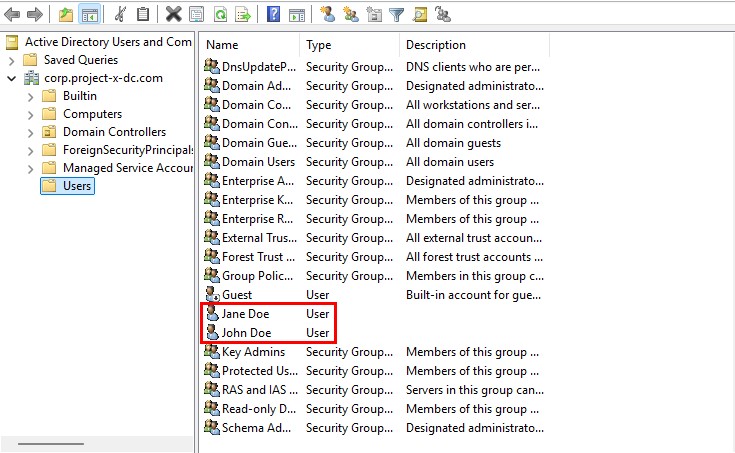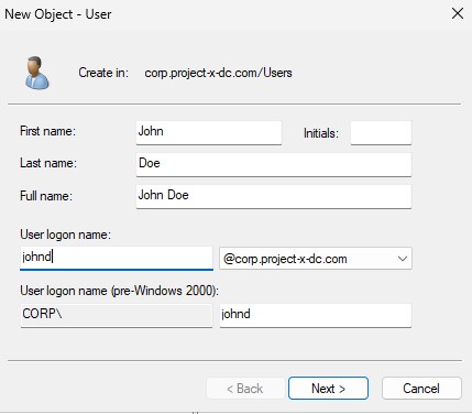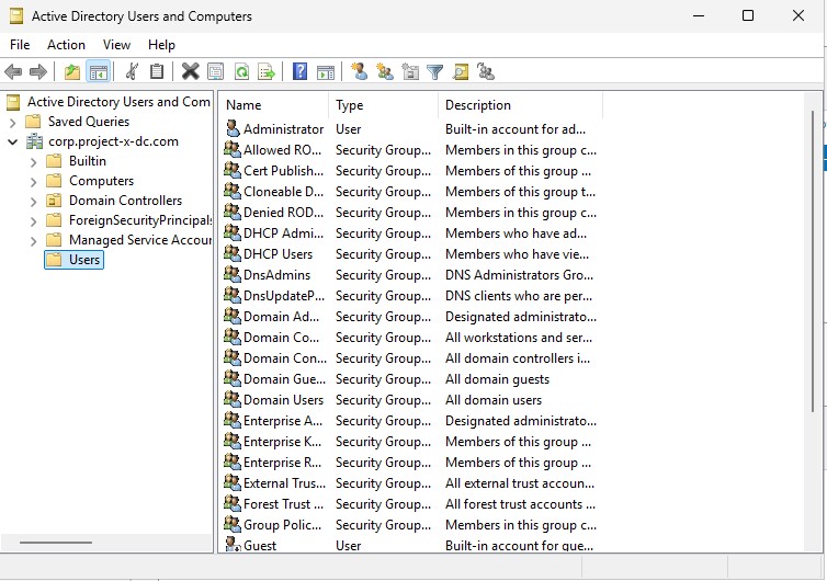 corp.project-x-dc.comwill be the domain used in this project. 2. Domain Controllers (DCs) - Servers that host the Active Directory database and perform authentication, authorization, and replication to other AD databases. 3. Organizational Units (OUs) - Containers within a domain used to organize objects logically. - Example: Separate OUs for HR, IT, and Finance. 4. Objects - Every entity in AD, such as users, computers, printers, and groups, is an object. 5. Groups - Security Groups: Used for managing permissions to resources. - Distribution Groups: Used for email distribution. 6. Forest and Trees - A forest is the highest-level container, encompassing multiple domains that share a common schema. - A tree is a hierarchy of domains within a forest. 7. Global Catalog (GC) - A distributed data repository that provides information about all objects in the forest for faster lookups. 8. Trust Relationships - Trusts enable users in one domain to access resources in another domain.
