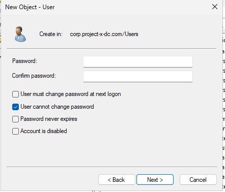 Select “User cannot change password” ➔ “Next”. Run through all default configuration settings.