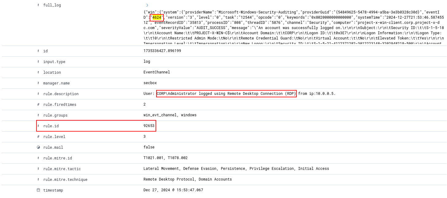 The data.win.event.logonProcessName: User32 denotes what process was used. User32.dll is used as part of the RDP process. How did we know this? We can generate sample logs by logging in over RDP with intentional successful and unsuccessful attempts. From here, the sample logs can be analyzed, and fields + values can be populated. Using your LLM of choice or Google, we can identify why these field values populated.