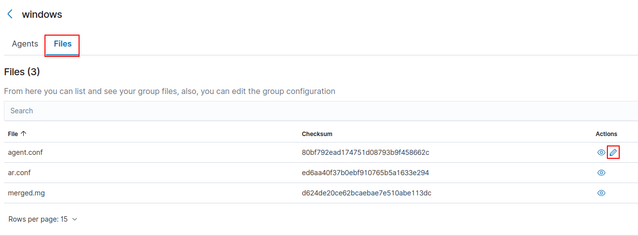 Select the “Files” tab ➔ agent.conf ➔ Select the Pencil Icon to edit the file.