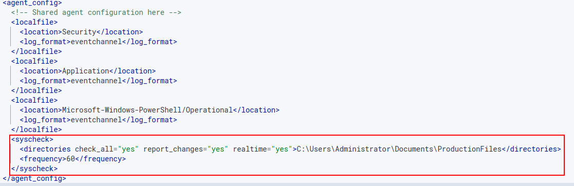 <directories check_all="yes" report_changes="yes" realtime="yes">: Defines what directory location to monitor. check_all defines the FIM module to scan all files in the specified directory. report_changes enables the system to report content changes made to a file. <frequency> defines how often the FIM module scans in seconds. The default is every 12 hours.