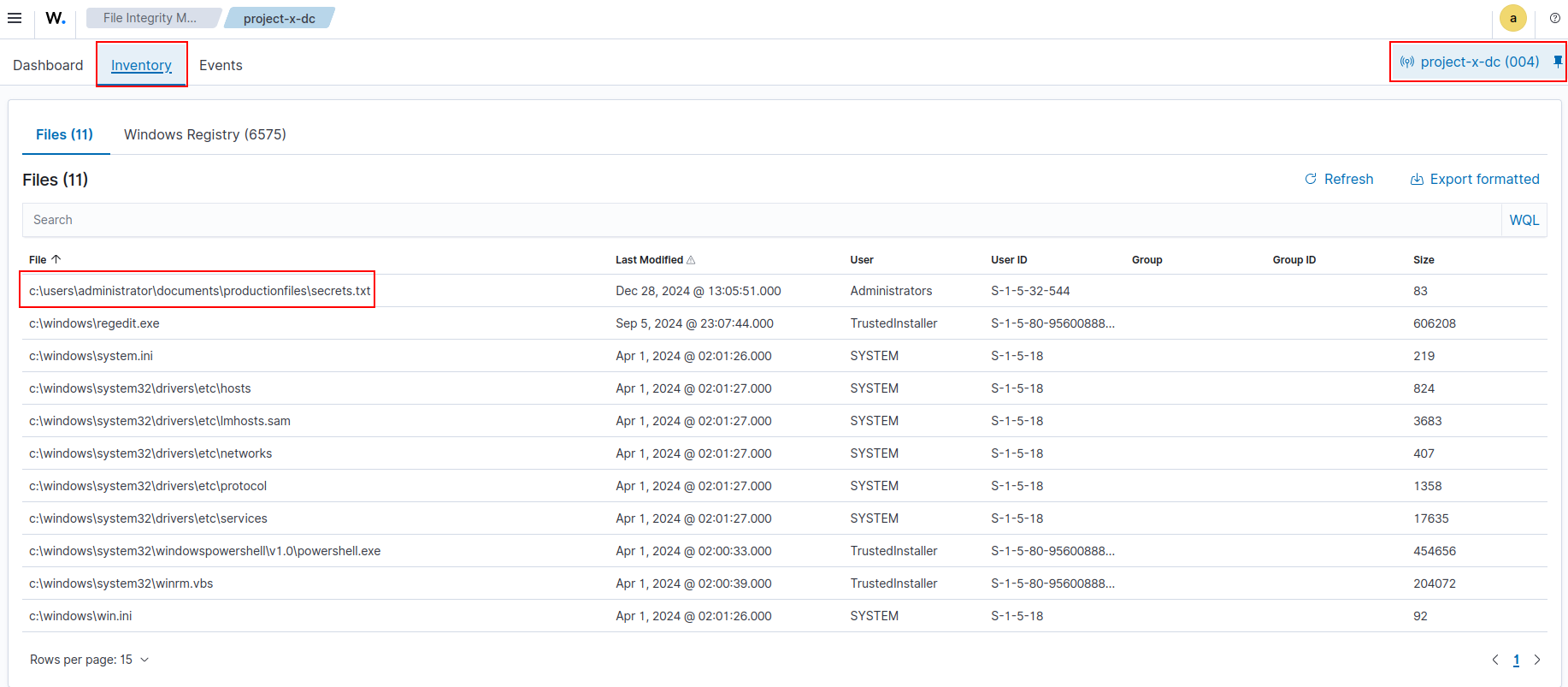 Navigating to the Events tab, if we were to change the content inside the secrets.txt file, we would have an event populate showcasing that the file has been modified.