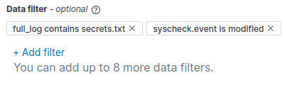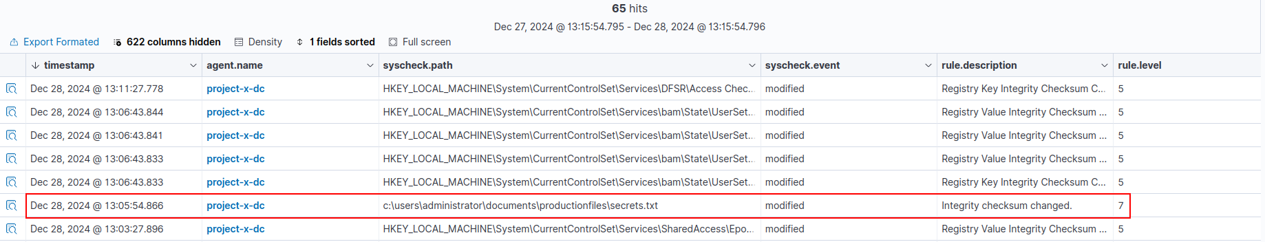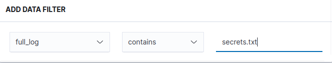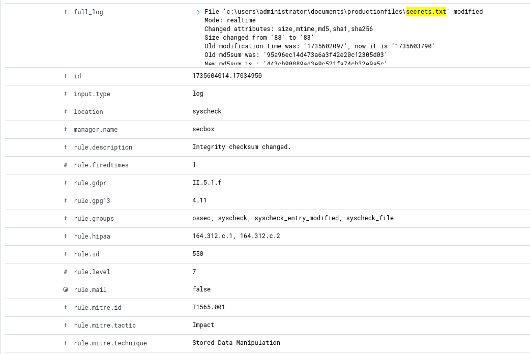 Based on the above sample log, let’s craft a query to select based on the “full_log” field containing the secrets.txt file and the “syscheck.event” fields to modified.