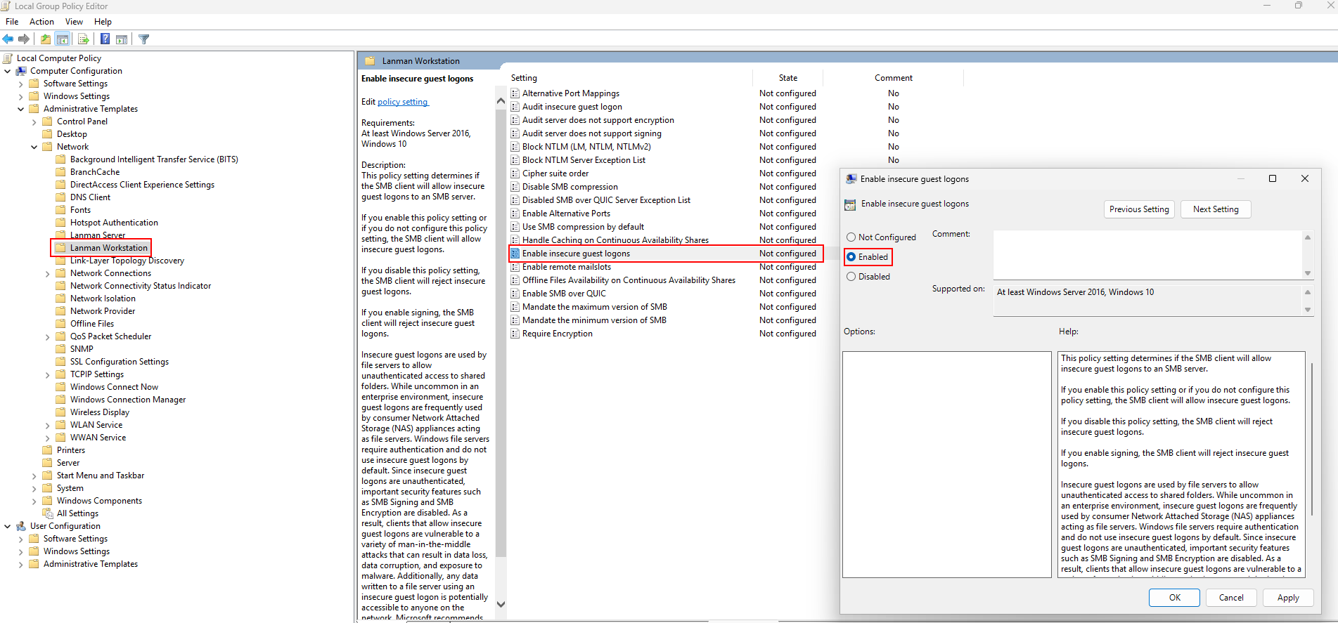 Go to Computer Configuration ➔ Administrative Template ➔ Network ➔ Lanman Workstation ➔ Double-click on “Enable insecure guest logons” ➔ Select “Enabled”.