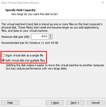 Keep the default "Split virtual disk into multiple files".