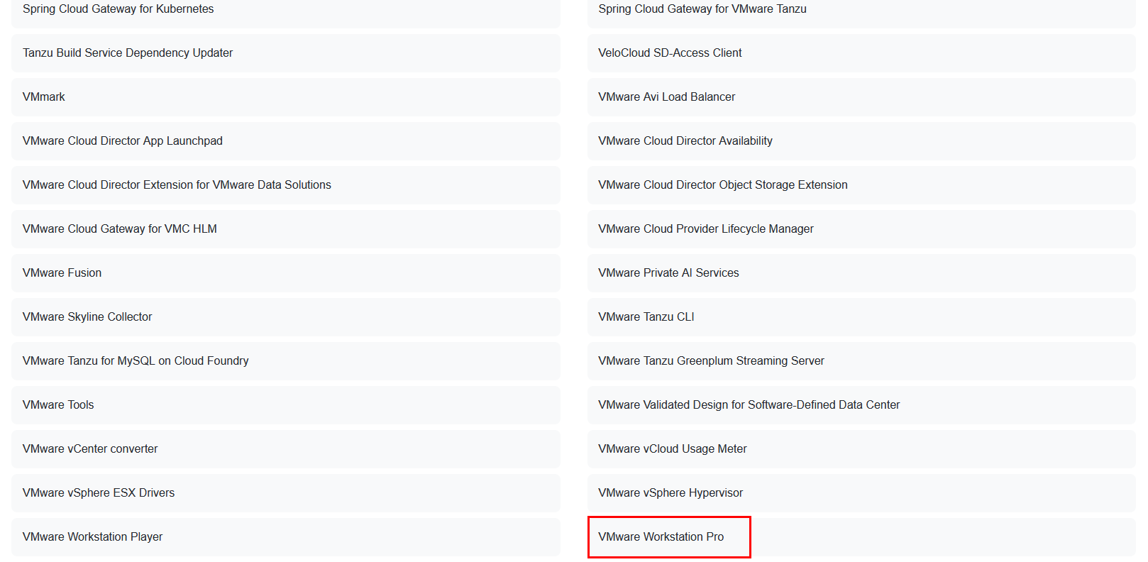 Scroll down at the very bottom until you see "VMware Workstation Pro", Select It.