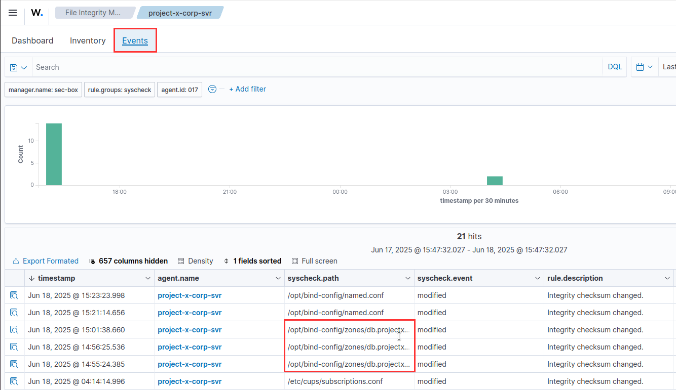 Logs and alerts will populate under the FIM module in Wazuh for these changes. This effectively adds an element of monitoring and prevention (if we set up a block action) to our DNS server.