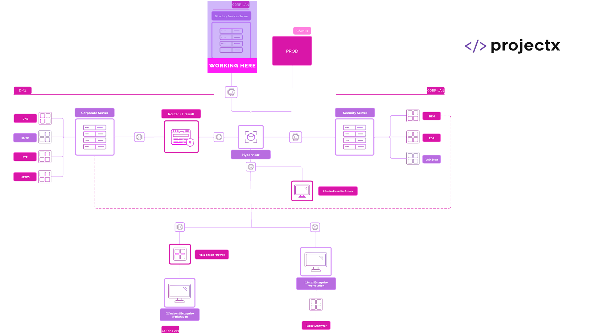 [project-x-fw]VM, pfSense, is effectively serving as a router. We have the router configured to send DNS information over to any host residing within ourCORP-LANnetwork segment. Active Directory uses DNS to manage and communicate with its computers. We are going to set the workstations client to use the[project-x-dc]. Our DNS capabilities will still be managed by our pfSense router. However, our workstation clients will first communicate with the Domain Controller. And remember, we also have ourdnscontainer... This is our internal DNS server. Don't worry about that one.