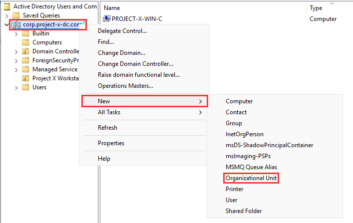 Right-click corp.project-x-dc.com "New" "Organizational Unit".
