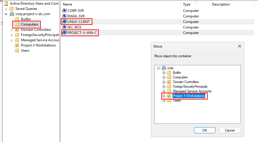 Navigate to the "Computers" folder, select "LINUX-CLIENT" and "PROJECT-X-WIN-C" Right-click ➔ "Move" ➔ Select "Project X Workstations".