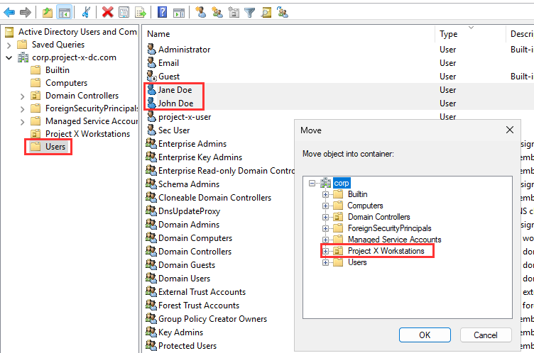 Navigate to the "Users" folder, select "Jane Doe" and "John Doe" Right-click ➔ "Move" Select ➔ "Project X Workstations".
