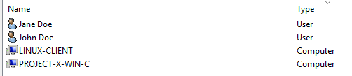 Organizational Units (OUs) are logical containers or groups used to organize and manage objects in Active Directory. During Enterprise 101, we created a few objects. Computer objects [project-x-windows-client] and [project-x-linux-client] were added. And a few accounts, John Doe and Jane Doe.