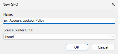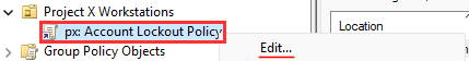 Right-click the ProjectX Workstations OU ➔ Create a GPO ➔ Name it: px:Security - Account Lockout Policy