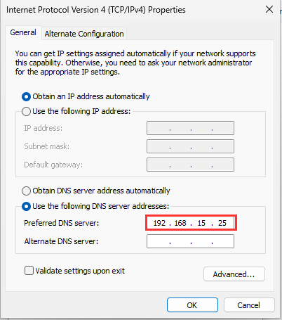 Let's set [project-x-win-client]'s DNS to our Active Directory Domain Controller's new IP address.