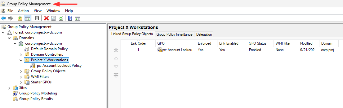 The px: Account Lockout Policy GPO has now been linked to the OU.
