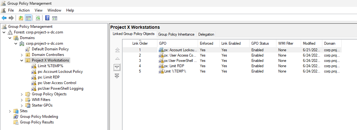 We will now have five GPO policies applied. Each policy provides a set of checks and restrictions to help harden our corporate attack surface.