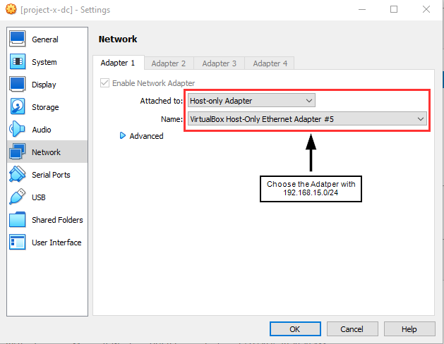 Change to the "Host-only Adapter" and the Ethernet Adapter ## with the 192.168.15.0/24 network.