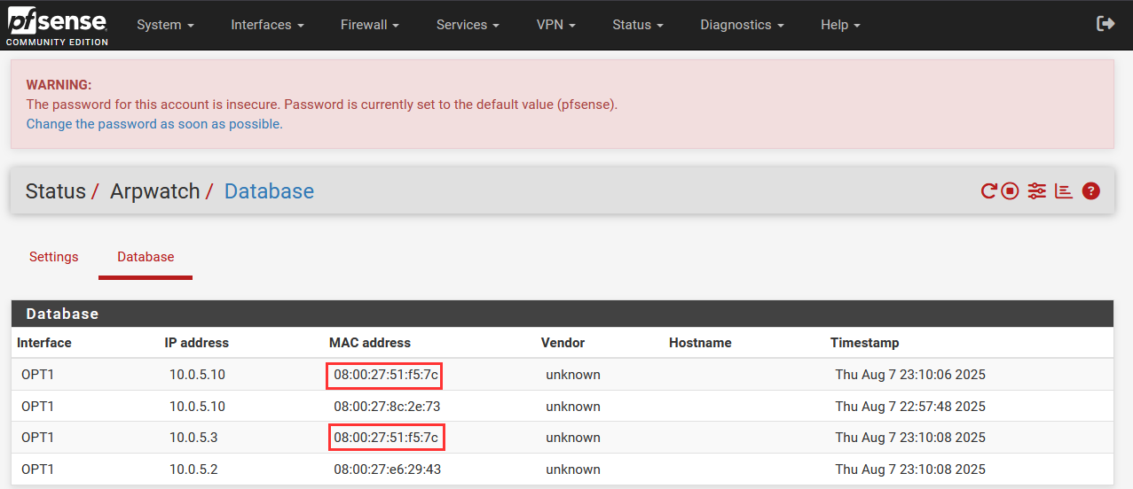 If we navigate to the "Database" tab, we will be able to see the IP to MAC address mappings.