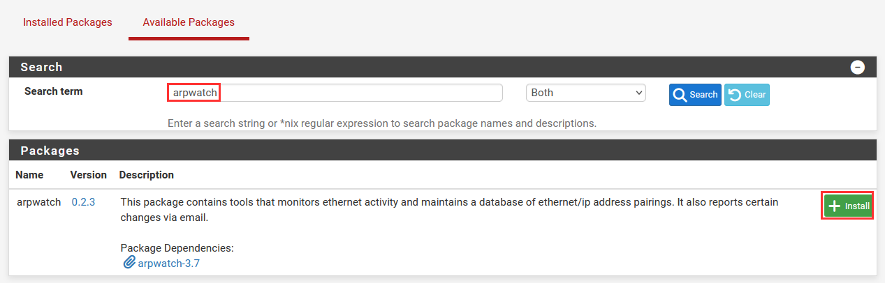 Look up "arpwatch" ➔ "+ Install" ➔ "Confirm". Wait for Arpwatch to install.