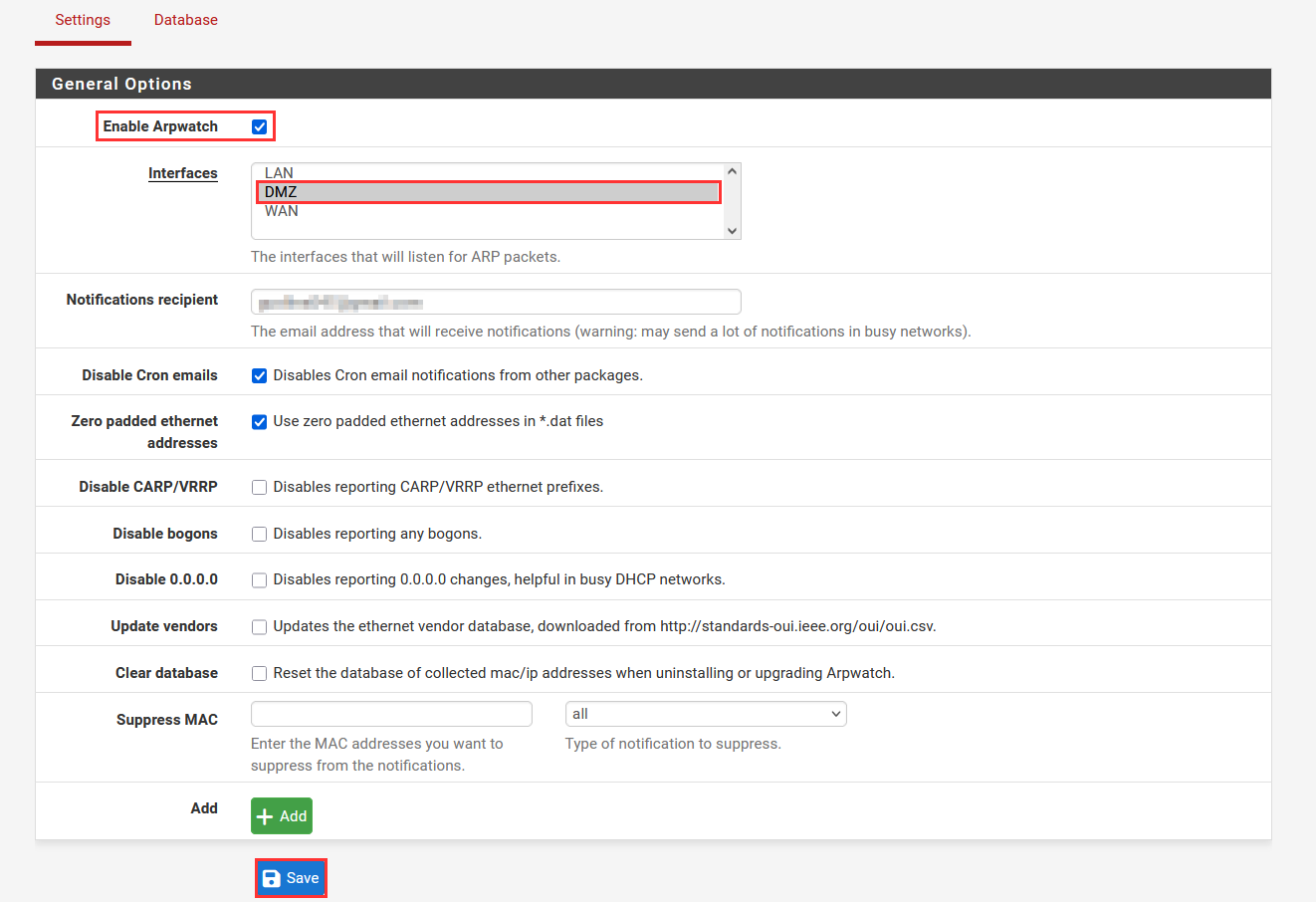 Here we can enable Arpwatch, select the Interface, and add a email address for when our MAC addresses change.