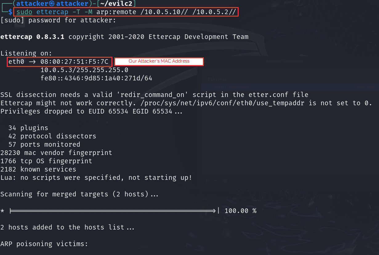 Let's redeploy our ARP poisoning attack, this time we will use the command-line tool ettercap for quick test.