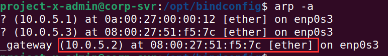 If we go to [project-x-corp-svr], we should see the ARP table has our gateway mapped to our MAC address.