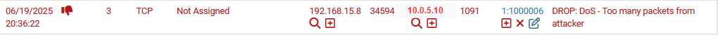 drop ip any any -> 10.0.5.10 any (msg:"DROP: DoS - Too many packets from attacker"; threshold:type both, track by_src, count 100, seconds 1; sid:1000006; rev:1;)