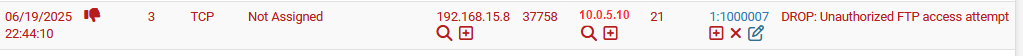drop tcp ![192.168.15.5] any -> 10.0.5.10 21 (msg:"DROP: Unauthorized FTP access attempt"; sid:1000007; rev:1;)