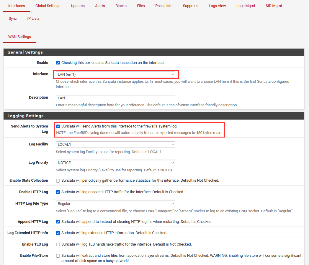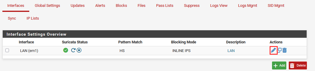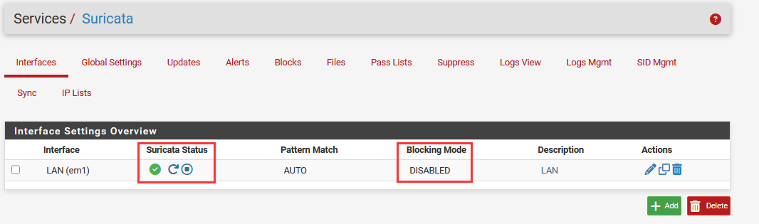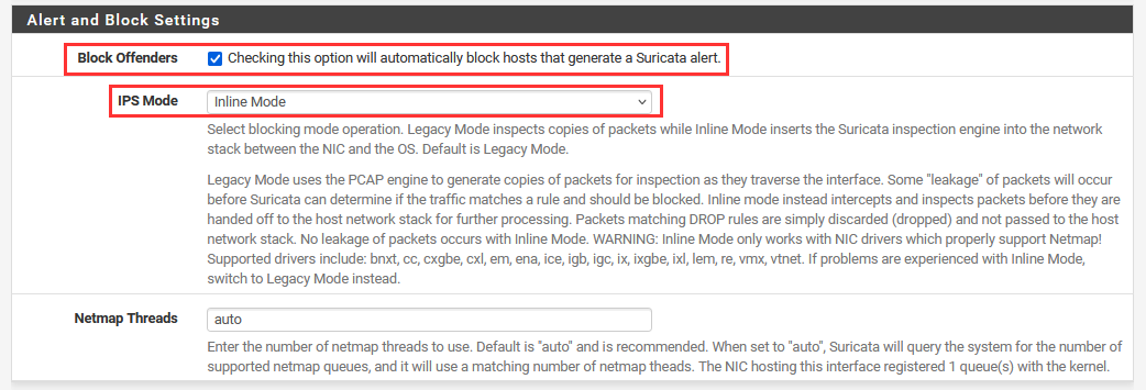 You can also see that "Blocking Mode" is "DISABLED". This means Suricata is serving as an Intrustion Detection System (IDS), only detecting activity by default. We will change this to Intrusion Prevention Mode.