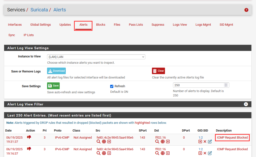 You should see the "ICMP Request Blocked", as denoted by our custom rule.