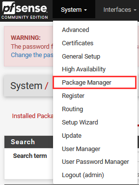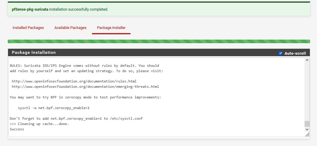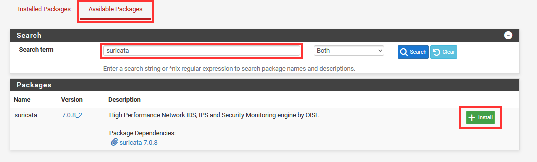 Select "Available Packages" ➔ Type "Suricata" ➔ "+ Install".
