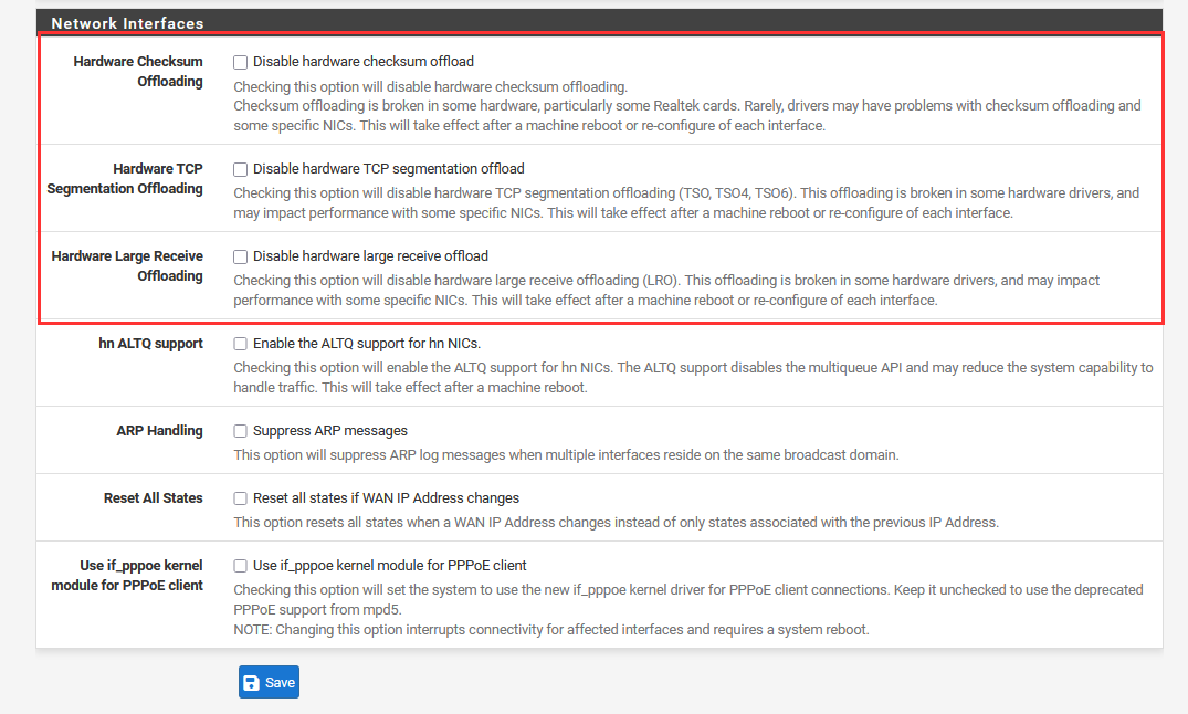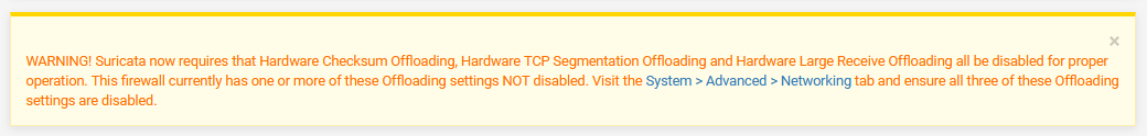 As part of enabling Suricata, we have to disable Hardware Checksum Offloading, shown in the WARNING! dialogue box. Hardware Checksum Offloading allows the computer's network interface card to take over the task of calculating and verifying checksums for network packets, instead of the CPU.