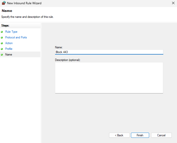 When the network packet hits the network interface, it will go through its OUTBOUND interface. The Windows Firewall will intercept the request and compare its destination port (443) to its OUTBOUND table, if a match is met, then it will handle it according to its rule definition. In this case, we are blocking any OUTBOUND requests.